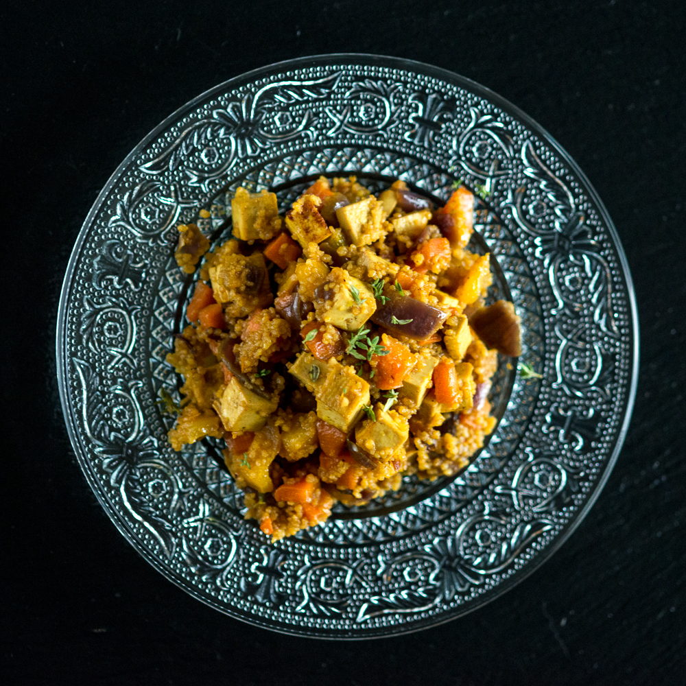 Questo cous è cotto direttamente in padella con le verdure. Metti l’olio e l’aglio sul fuoco, appena l’aglio si imbiondisce aggiungi le verdure e il tofu, fai saltare tutto a fiamma alta, se serve aggiungi poca acqua, continua a mescolare. Appena vedi che le verdure sono quasi pronte aggiungi il cous cous, il timo e un mestolo di acqua, abbassa la fiamma e copri la pentola con un coperchio per un paio di minuti. Aggiungi la curcuma il sale e il pepe e lascia riposare un minuto. Impiatta… il cous cous è pronto.