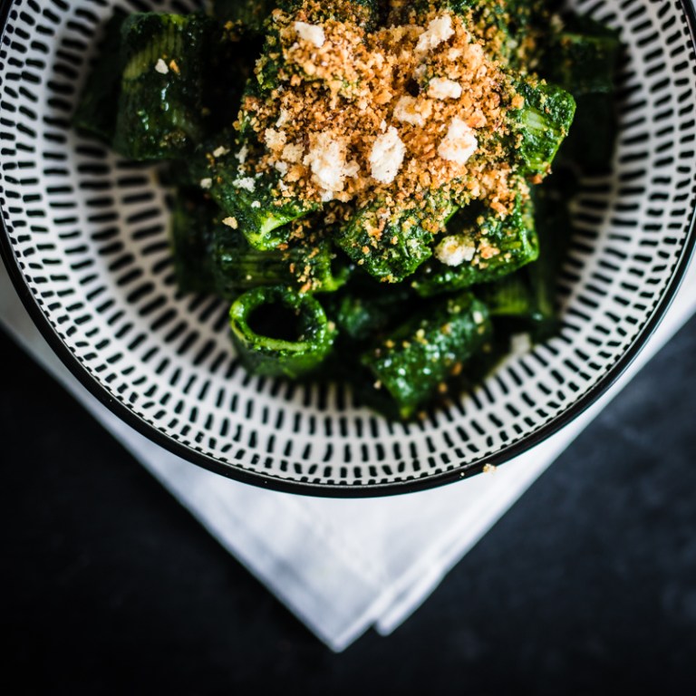 Salta la pasta nella crema verde, mescola bene, impiatta e completa con il pangrattato tostato.