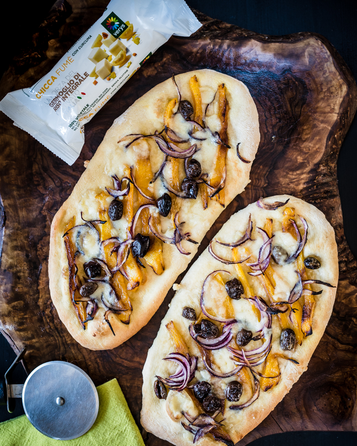 PIZZA PEPERONI, CIPOLLA, TAGGIASCHE CON CHICCA FUME’